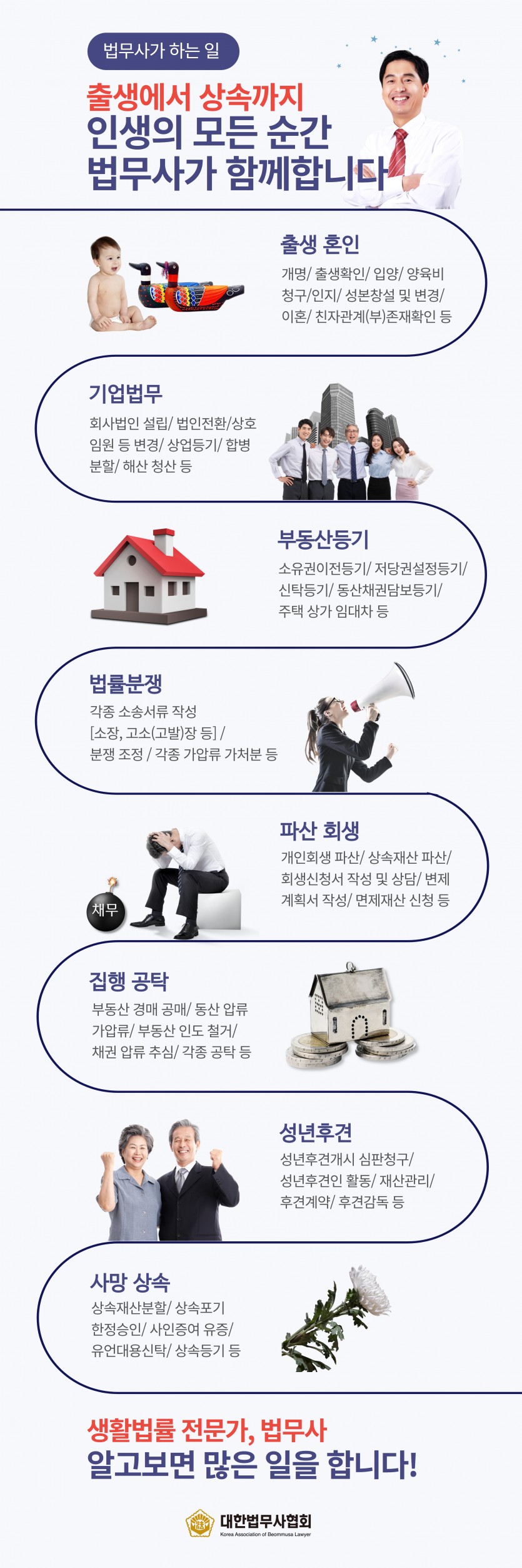 출생에서 상속까지 인생의 모든 순간 법무사가 함께합니다. 출생혼인, 기업법무, 부동산등기, 법률분쟁, 파산회생, 집행 공탁, 성년후견, 사망상속 등 생활법률 전문가, 법무사 알고 보면 많은 일을 합니다!
