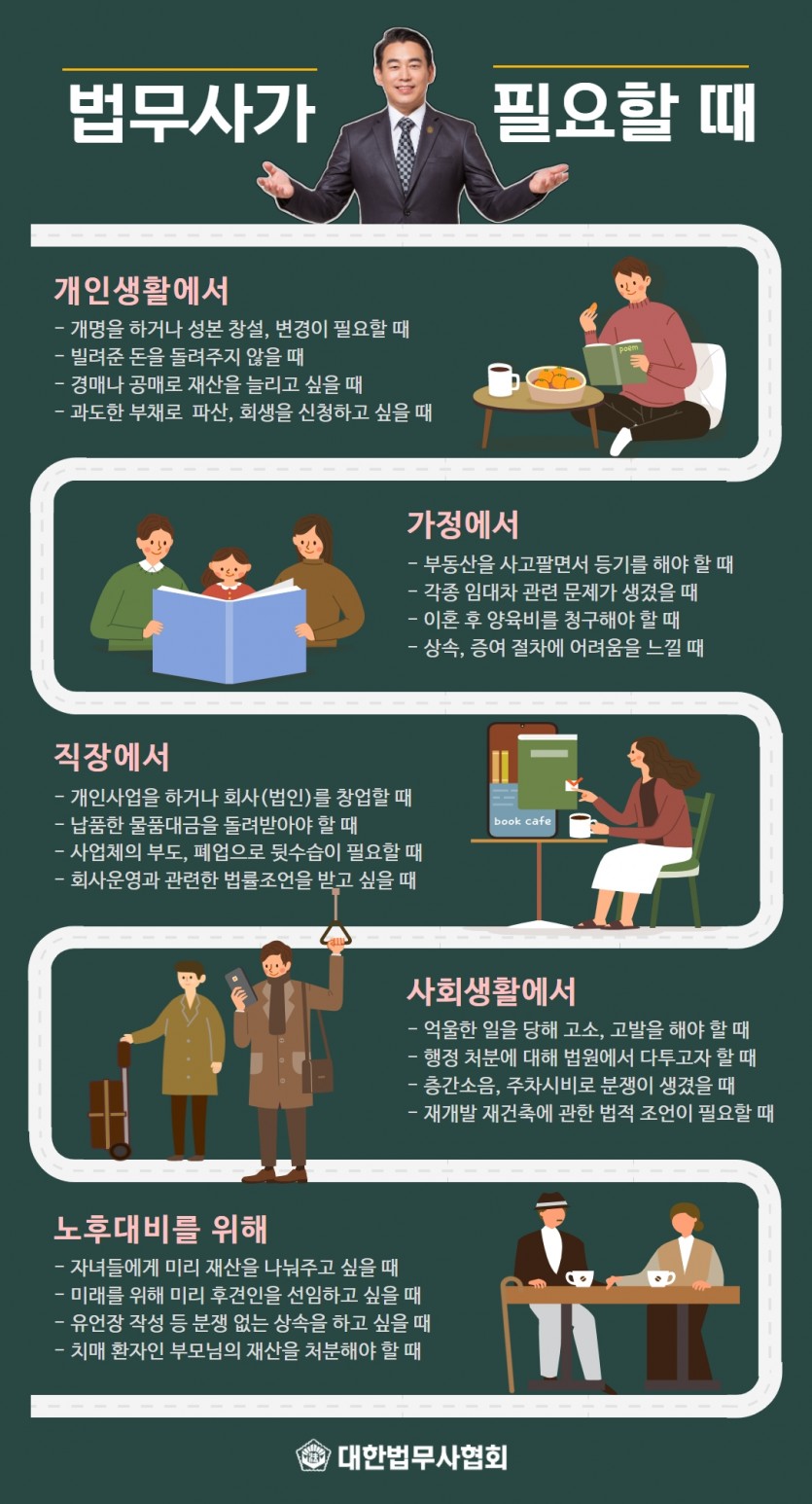 법무사가 필요할 때 : 개인생활에서, 가정에서, 직장에서, 사회생활에서, 노후대비를 위해, 필요할 때에는 이상룡법무사와 함께해 주십시오. 항상 여러분들과 함께하겠습니다.